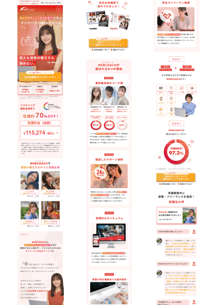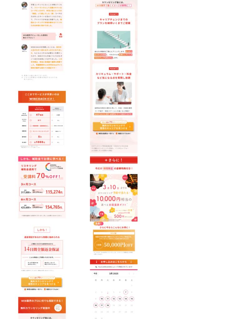 ランディングページ制作 2025年10月27日 最終更新日時 : 2025年10月27日 portfolio 【製作時間】20時間【使用ソフト】Photoshop・illustrator・Figma・HTML・CSS・jquery【担当業務】デザイン・実装【意識した亊】スクロール離脱を防ぐためjqueryで動きをつけたLPを作成しました。